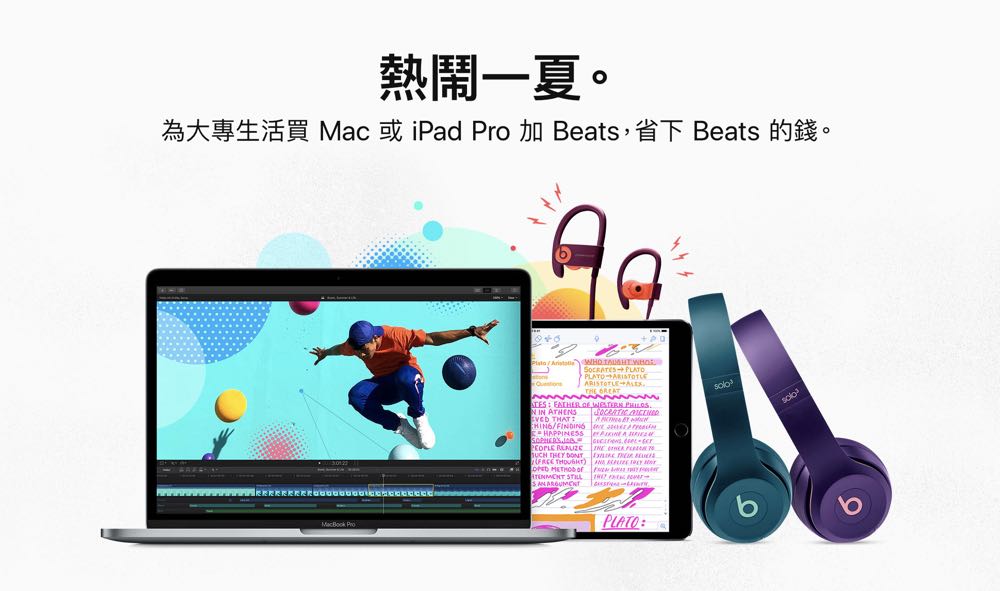 這次的返校日方案不僅針對新品做出優惠折扣,還提供了購買指定款電腦,例如 Mac、iPad Pro 等系列,還能免費加選 Beats Solo 3 Wireless 頭戴式藍牙耳機(原價 NT$9,990 元),而買 iPad Pro,則可以免費入手 Powerbeats 3 Wireless 入耳式耳機 (原價 NT$6,490 元),如果不需要耳機的朋友們也能選擇 Apple Care 8 折的方案來保護自己的 Apple 新品!