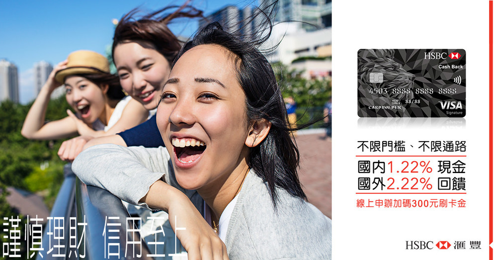 謹慎理財,信用至上。匯豐信用卡循環信用年利率:5.68%~15.00%,循環利率基準日104年9月1日。每筆預借現金手續費為新台幣100元+預借現金金額x3.5%;其他費用請洽匯豐銀行網站查詢。