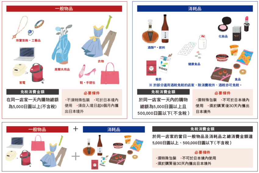 從家電、3C、配件、衣服鞋子等一般物品,到酒類、食品、化妝品、香菸、藥妝等消耗品,基本上所有項目都屬於免稅對象,但還是要符合以下條件。