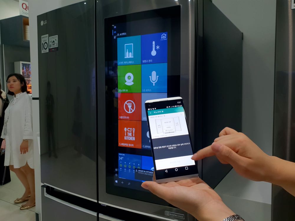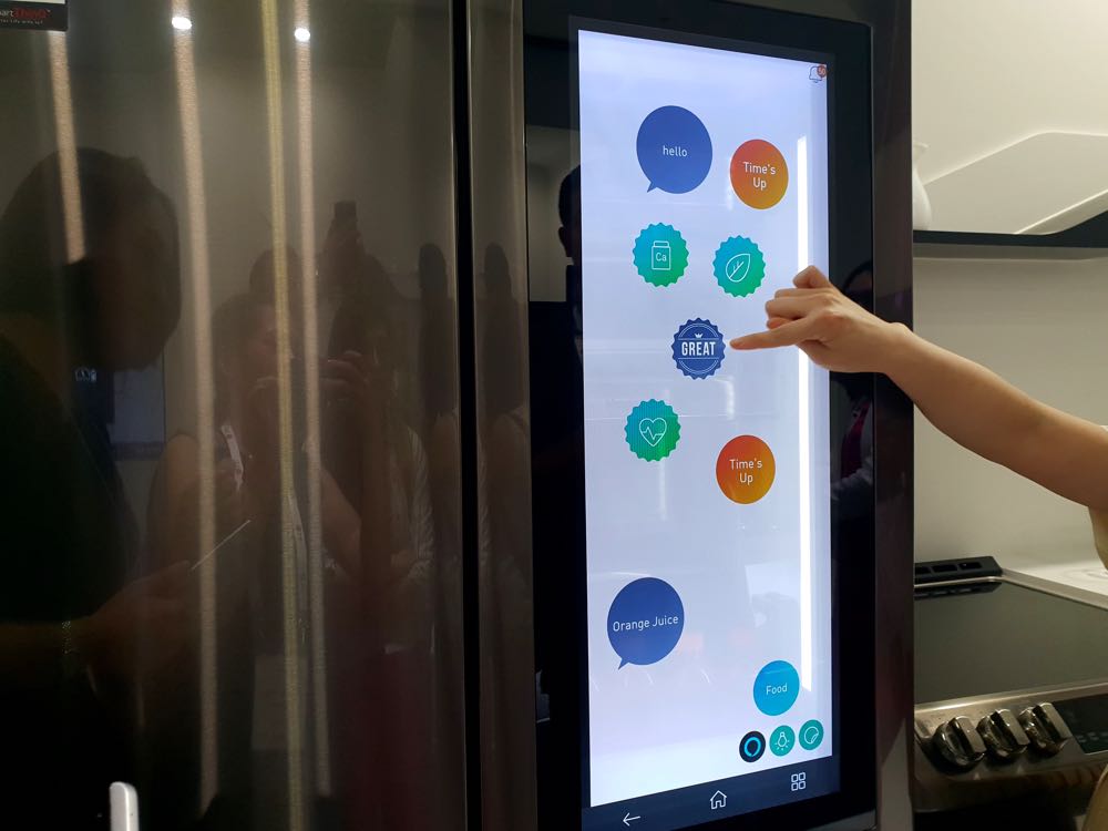 另一個也是相當有趣的展示就是在冰箱方面,原來 LG 針對韓國國內與北美地區市場分別加入微軟以及 webOS 作業系統,搭載著 webOS 作業系統的冰箱還能讓用戶自行在螢幕上塗鴉、筆記留言呢!