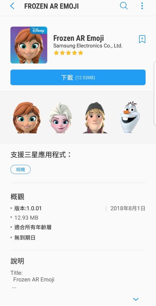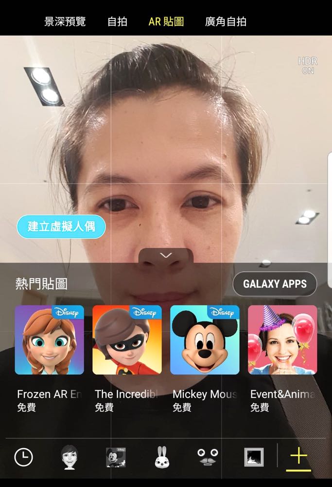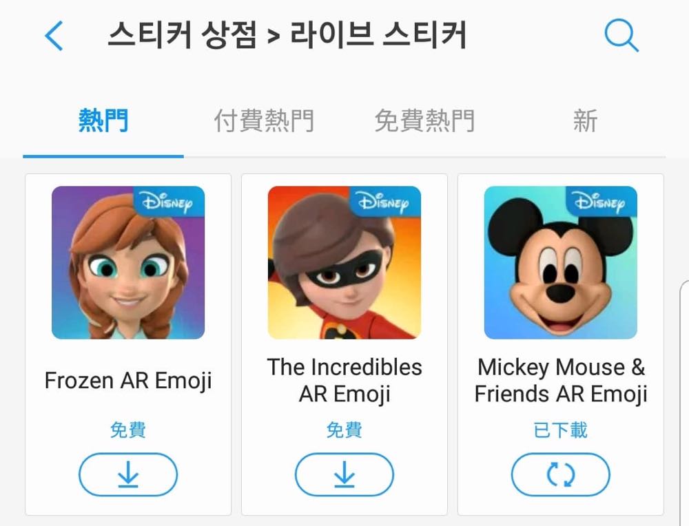 用戶只要前往相機中選取「AR 貼圖」後就能藉由右下角的「+」 或是 「Galaxy Apps 」就能看見冰雪奇緣跟其他 AR 貼圖的選擇並且進行下載。