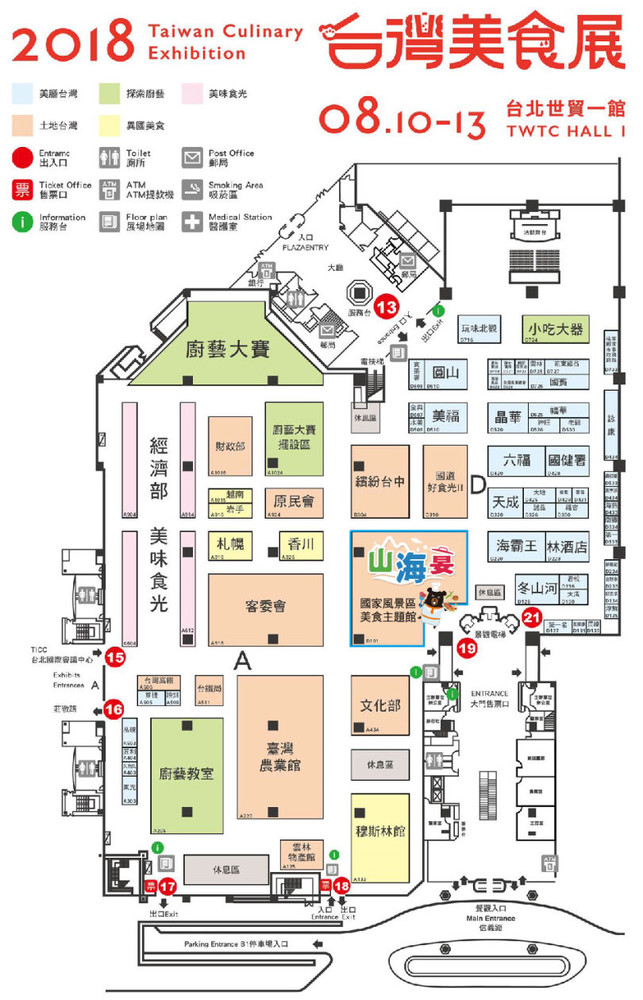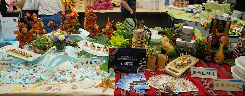 ▼位於世貿一館大門入口旁的「山海宴-國家風景區美食主題館」,由信義路大門入口進入,位置相當好找!現場除了有精緻的菜餚展示,還可以試吃選購當地特產,透過遊程的規劃,趁機了解全國12個國家風景區的自然與人文特色,深度探索各地美食文化與臺灣之美。