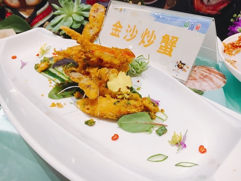 ▼金沙炒蟹,特別選用來自東北角的紅蟳,裹上麵粉酥炸後起鍋,再將香油、鹹蛋翻炒至金黃起泡,加入蒜苗、紅蟳、芝麻拌炒,不僅兼具視覺與味蕾享受,而且滋味鮮美多層次,讓人好想立馬咬一口啊!