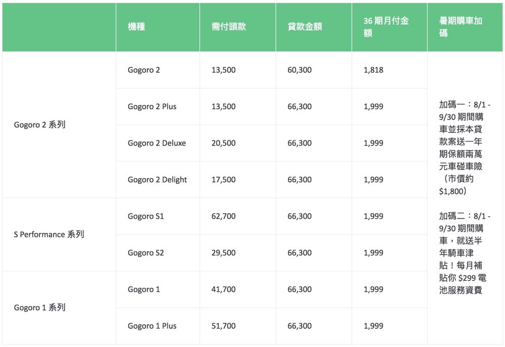 根據 Gogoro 官方列出的金額,我們可以發現 Gogoro 2 的標準款與 Plus 兩款系列甚至頭款只要付 13,500 元就能夠在未來 36 個月中以每個月 NT$1,999 元來分期付款。
