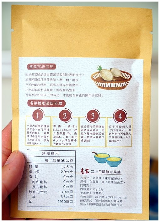 ▼高家老菜脯是切塊後並抓好適合比例,作成單包裝,好存放也好預估料理的份量,所以拆開一包50g老菜脯後,要燉雞湯前,我們其實不再需要切塊,而這一包就是煮一鍋湯,大概是大同電鍋十人份內鍋的容量,方便煮好湯!(高家老菜脯對於安全把關,送檢3大項『農藥殘留、防腐劑、著色劑』全數”零檢出”)