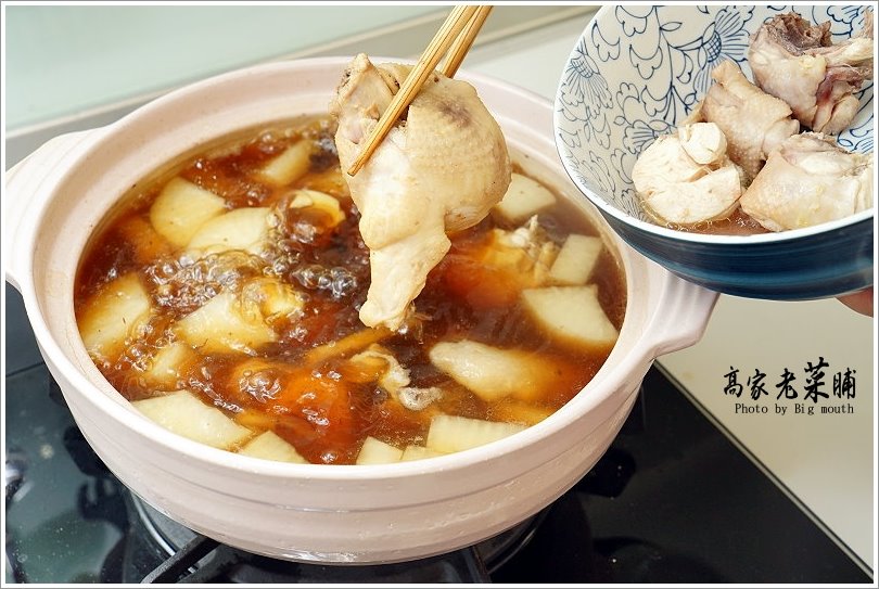 1.高家老菜脯取出,用開水稍微沖過,不需要浸泡,以免營養流失。雞腿切塊川燙備用。