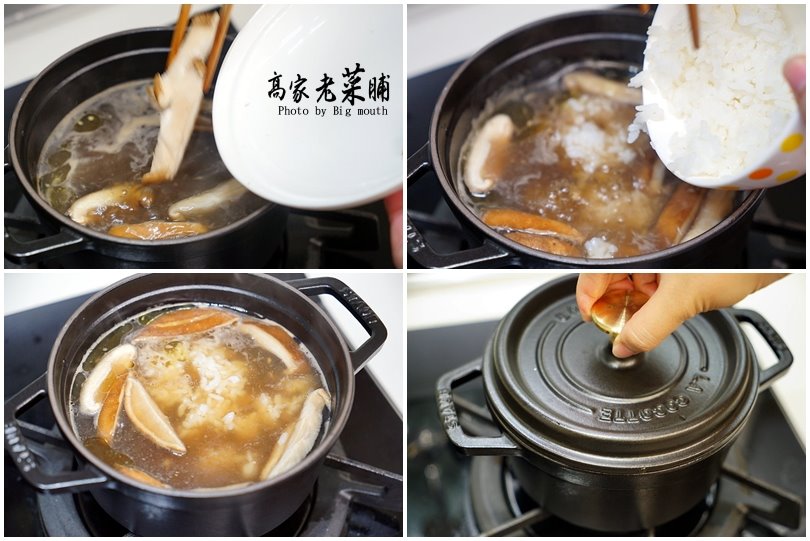 ▼湯滾後,依序加入香菇、白飯,若怕黏鍋可以邊煮邊攪拌。