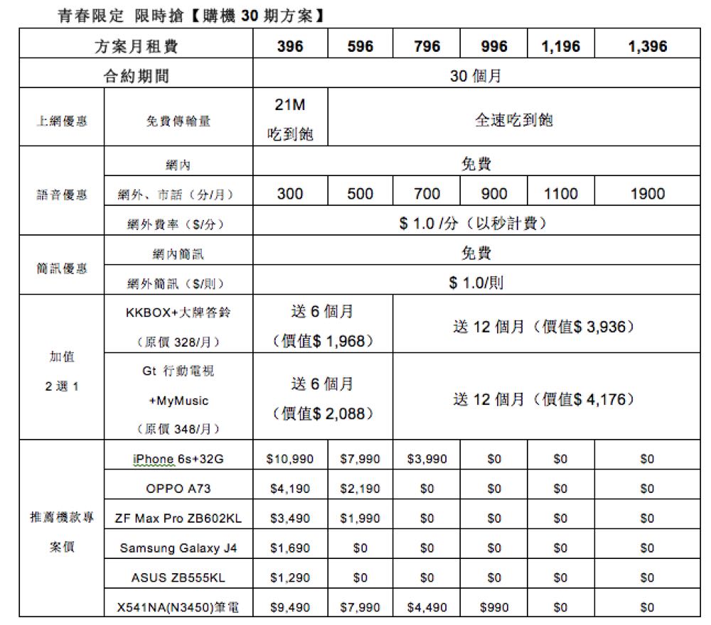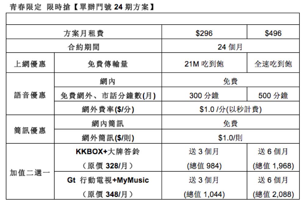 亞太電信表示,為了迎接即將到來的開學季,即日起只要申辦全新 4G「壹網打勁」吃到飽系列,包含單門號及購機方案,便能依照申辦資費不同,享 KKBox 免費的優惠好康;以 396 / 596 購機方案為例,搭配任何一款手機、筆電或其他商品,可享「KKBOX」加「大牌答鈴」免費 6 個月服務(原價 NT$328/月),搭配 796 資費更可以享免費多達 1 年的服務,如果 796 資費再搭配 iPhone 6s Plus(32G),手機更是只要 NT$3,990 就能帶回家;單門號 296 / 496 資費同樣也可享 3 / 6 個月的免費服務;除了「KKBOX」加「大牌答鈴」的組合包外,也可以選擇「Gt 行動電視」加「My Music」的組合(原價 NT$348 / 月),不論喜愛音樂或是行動電視服務的消費者,都能找到喜愛的方案。