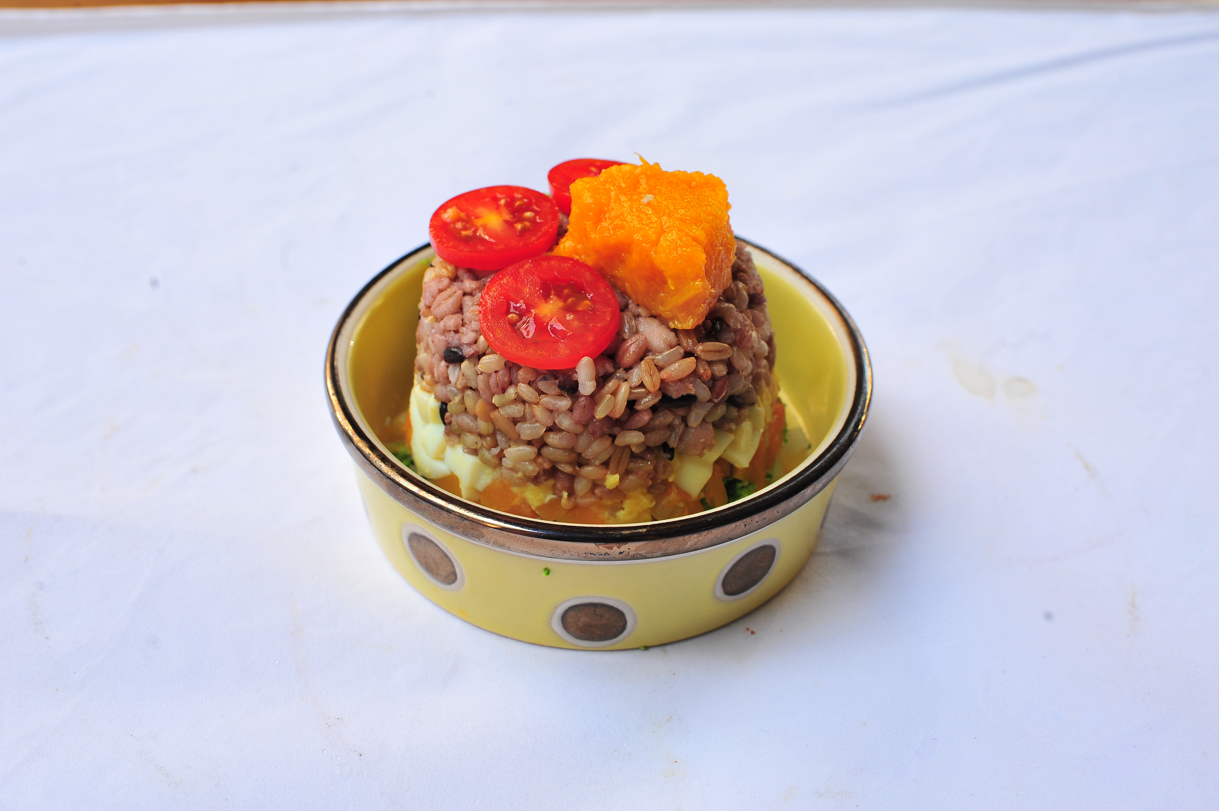 毛孩鮮肉塔塔120元有南瓜、番茄、五穀米和肉凍等,是店家特製寵物餐點,營養均衡也有人毛孩生日點來慶生唷
