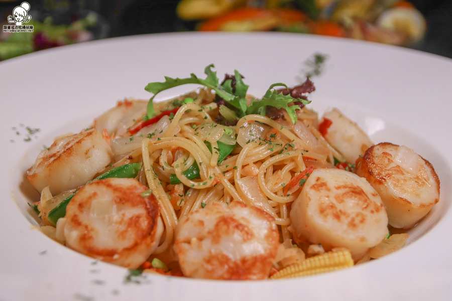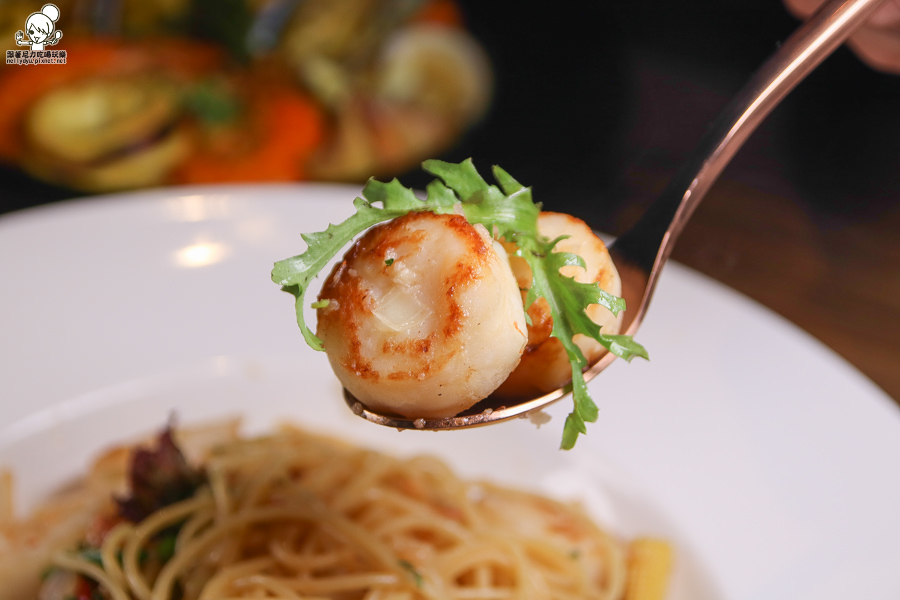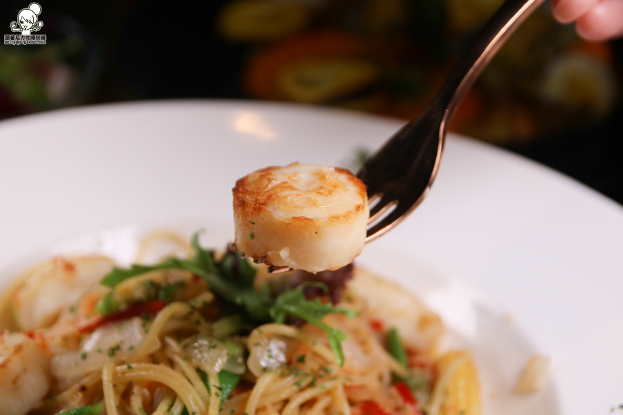 帶有開胃辣度的干貝義大利麵,用香辣櫻花蝦點綴,味道不會太過於搶味,保有干貝的鮮甜