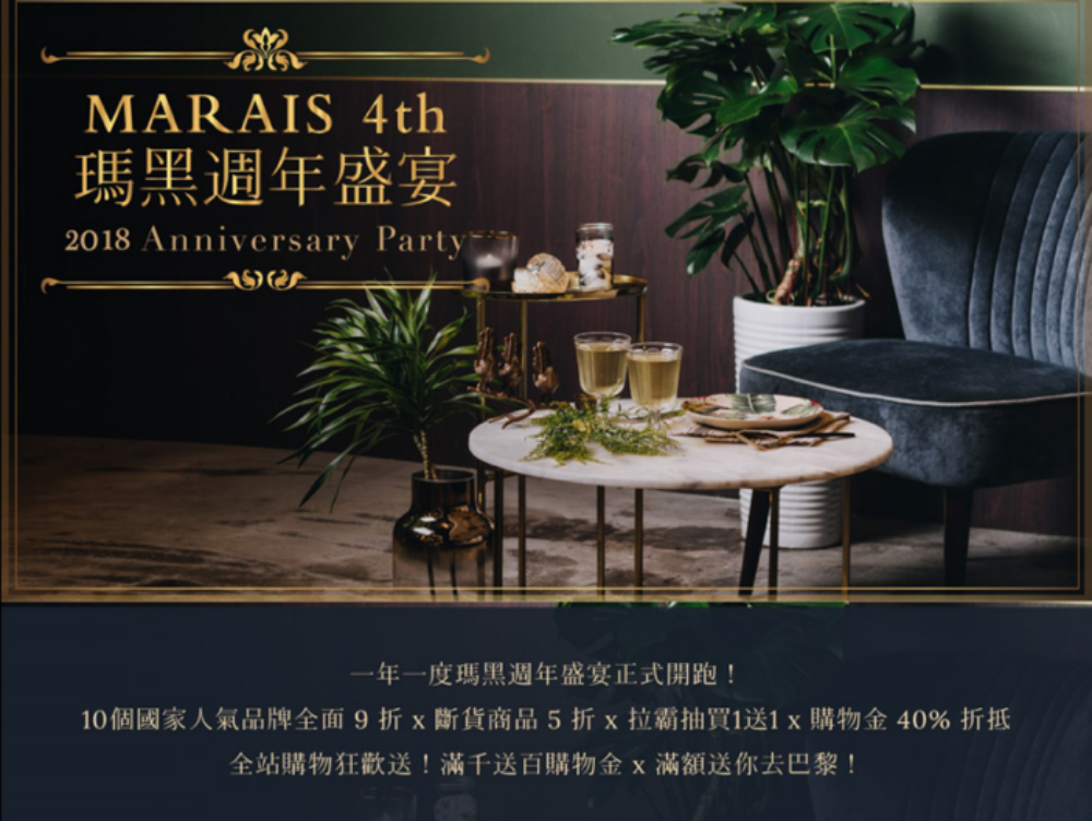 一年一度瑪黑生日活動「瑪黑週年盛宴」於 8/29 正式展開,搶先在百貨週年慶季節前率先開跑!今年的瑪黑週年盛宴集合來自全世界都精彩新品及超級優惠: 10 國家 x 20 人氣品牌全面 9 折、滿千送百購物金、經典斷貨款最後回歸 5 折,消費滿額更直接送消費者去巴黎玩!並首度呈上瑪黑有史以來最優惠的「超級貴賓 Premium PASS」限定方案,成為貴賓可獨享一年購物無限次 8 折!