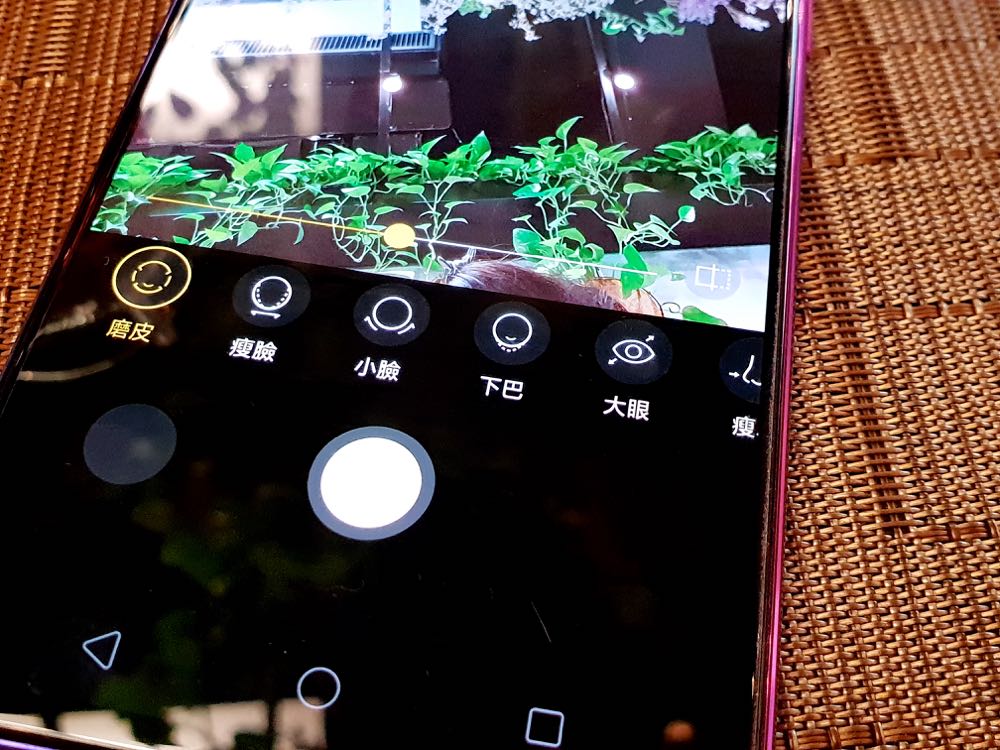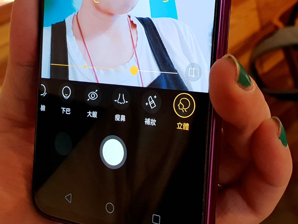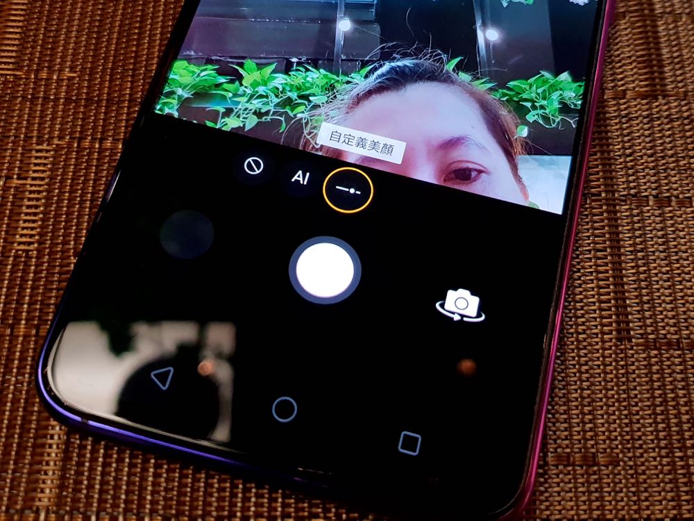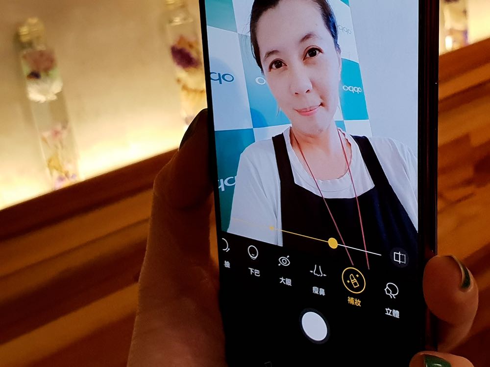另一個相機的部分,其實與稍早的 Find X 有著差不多的效果。自拍依舊美顏的很自然、AI 辨識可以支援多種場景、萌拍能替換多種逗趣的頭套、背景,甚至還有 AI 自定義,能讓用戶針對下巴、瘦臉、小臉、大眼、磨皮等微調,而且還可以直接來補妝!