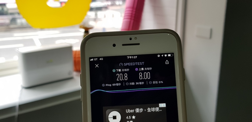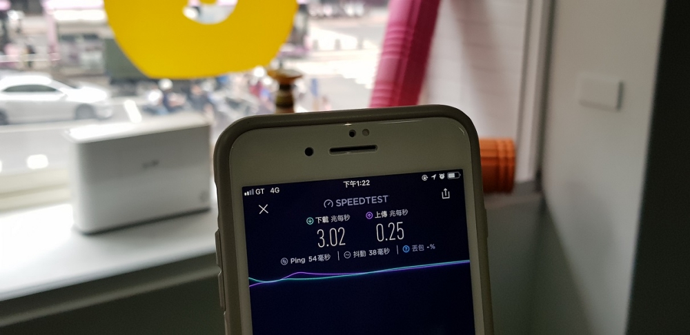 除了一般住戶外,「魔速方塊2.0」也很適合較狹長的營業空間,以中正區南昌路上的一間靠大馬路旁位於2F的健身房為例,窗邊測得數據分別是下載32.3 / 上傳10.4(Mbps)的網速,但往健身房深處移動5公尺,因有樑柱的阻擋,下載/上傳便只剩下3.02 / 0.25(Mbps),同樣在安裝「魔速方塊2.0」之後,原本為在室內深處飛輪旁的網速,則提升為下載/上傳20.8 / 8.00(Mbps),網速在下載的部分同樣約有6倍以上的提升,確實改善室內深處的涵蓋並同時提升了原本弱訊地區的網速。