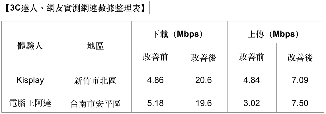 此次「魔速方塊2.0」的推出,特邀請點子生活部落總編輯Kisplay及電腦王阿達網站負責人阿達兩位國內知名3C達人,分別在其新竹與台南的住家內,進行「魔速方塊2.0」實地測試,點子生活Kisplay在其位於新竹市北區的透天厝住家5樓實測,室內的訊號在下載時,由4.86 Mbps提升至20.6 Mbps、上傳則是由4.84 Mbps提升至7.09 Mbps;電腦王阿達在其位於台南市安平區的住家所測得數據,也由下載時的5.18 Mbps提升至19.6 Mbps、上傳則是由3.02 Mbps提升至7.5 0Mbps。