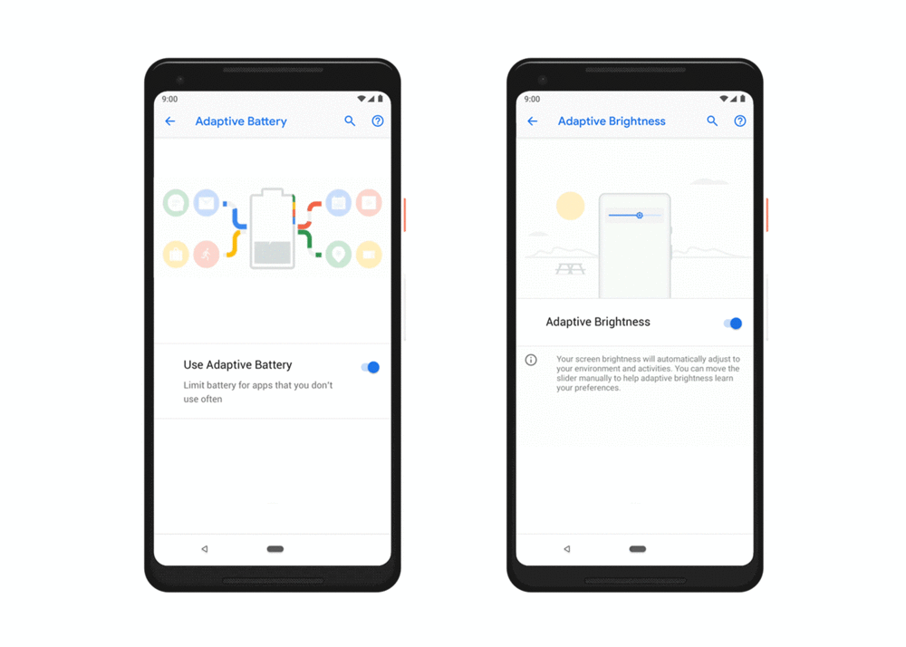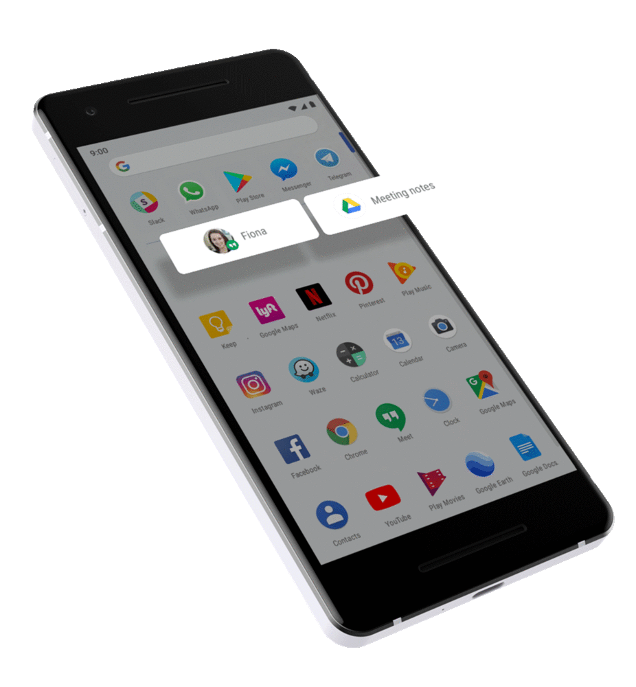 。「App Actions」- 根據目前情境預測下一步動作,並直接顯示於手機上。例如星期二早上,正在準備通勤上班時:系統會建議你使用 Google 地圖規劃前往公司的路線,或是透過 Google Play 圖書繼續播放有聲書。等到你下班後戴上耳機,系統可能會顯示打給家人或開始播放你最喜歡的 Spotify 播放清單。