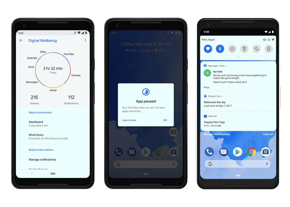 在 5 月舉辦的 Google I/O 大會上,Google 還介紹多項有助於健康使用數位科技的功能,包括:會顯示裝置使用時間的全新 Dashboard;App Timer 可讓使用者對應用程式設定時間限制,並於時間結束時自動將主螢幕上的應用程式圖示轉成灰色;全新的零打擾 (Do Not Disturb) 模式,這會關閉螢幕上顯示的所有視覺干擾;以及 Wind Down 模式,這會在就寢時間前開啟夜燈 (Night Light) 和零打擾 (Do Not Disturb) 模式,並將螢幕顏色轉成灰階。