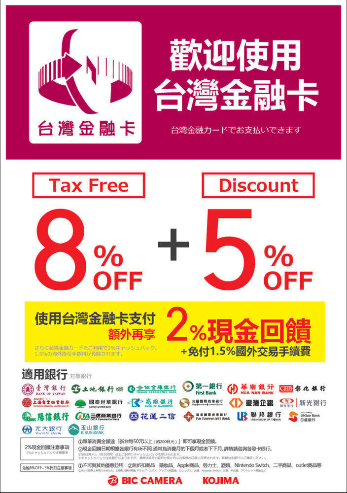 這裏來教大家現在來Bic Camera消費最省錢方式,除了原本的Bic Camera優惠券之外,也別忘了再帶一張台灣金融卡!沒看錯,現在用台灣金融卡在Bic Camera買東西除了可以獲得2%現金回饋,還能免1.5%的海外交易手續費喲!這麼好的方法一定要學,以下就是目前最省錢的買法囉~