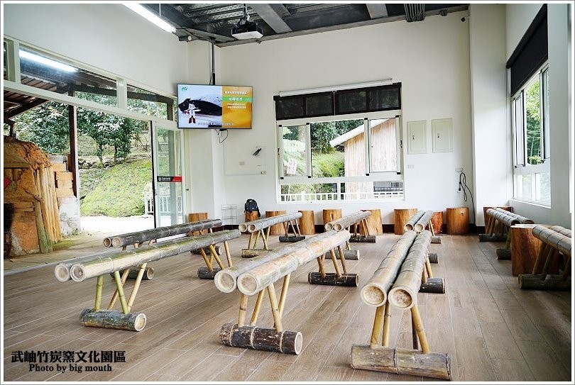 ▼裡頭的座位區也是採用竹子所製成,大家可以先稍作休息看個影片,對竹炭製程也會有個基本概念!