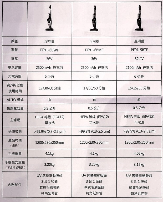 Pure F9 於 9/1 起在伊萊克斯百貨櫃點與各指定通路上架販售,建議售價為 NT$26,900 元,共推出 珍珠白、可可棕與星河藍三種顏色,其中星河藍為入門版本,售價為 NT$24,900 元,三款規格表如下。只要在 2018/9/1 ~ 2018/12/31 間購買 Pure F9 並在指定日期內完成線上商品登錄,即可享受首次免費更換電池服務。