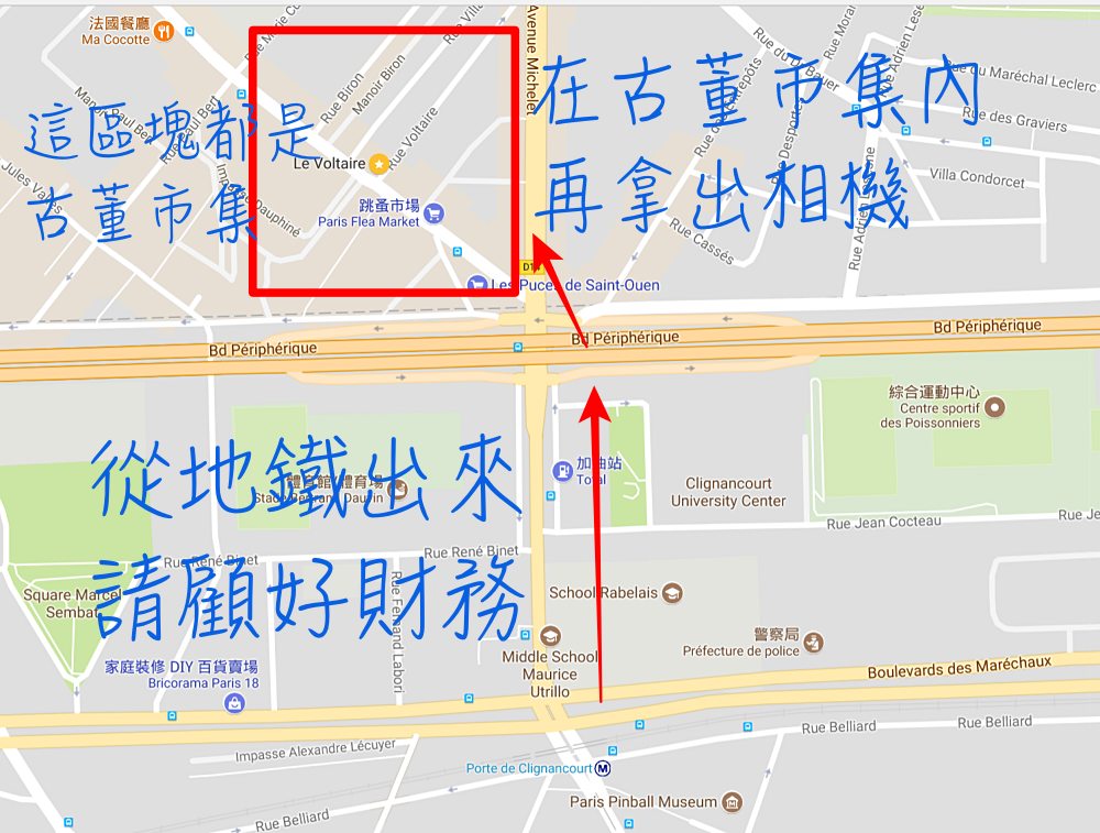 巴黎這一個古董市集有一點複雜,沒有將法文名字打上標題的原因是,稍微打錯可能會害讀者被搶劫,所以爆肝這裡畫了一個地圖,定位可以是Paris Flea Market或者是Marché Dauphine,但最好不要是網路上的Les Puces de Saint-Ouen聖圖安,免得自己惹麻煩上身。