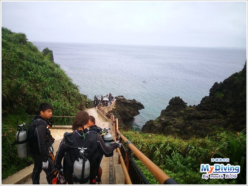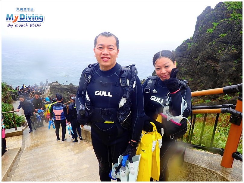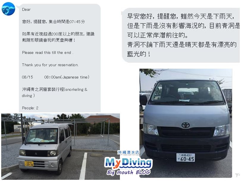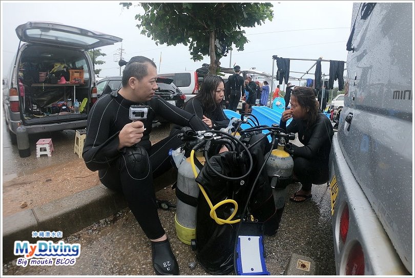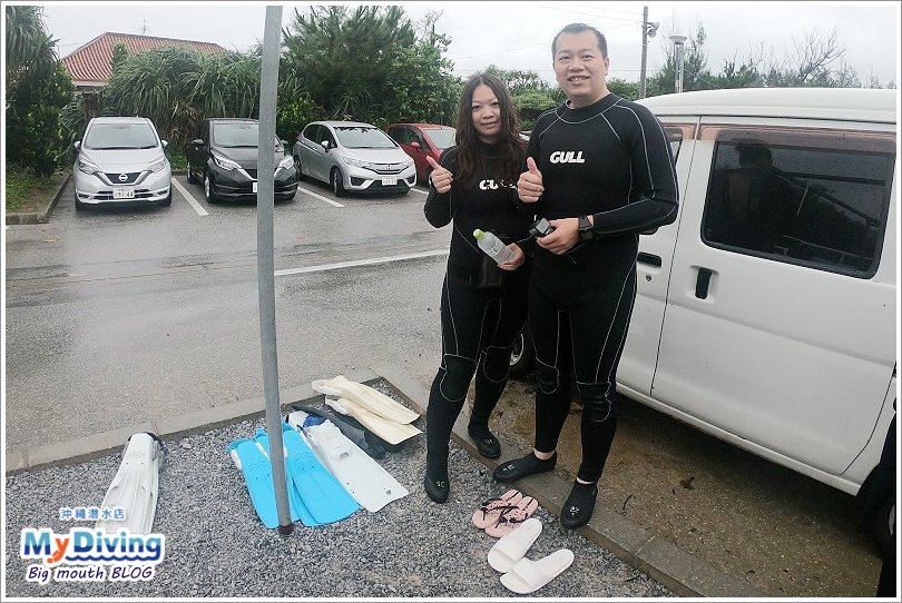▼據說早上的海水比較清澈,所以我們就直接預約早上8點的時段,參加的是青之洞窟套裝方案(浮潛加潛水,約4小時,一人12000日圓+8%消費稅),只要設定導航來到真榮田岬(Mapcode:206062834*20)就會看見一大片的停車場(100日圓/一小時),將車停好再去跟MyDiving員工會面即可!當天一早起床的時候看見下超大雨,大口心裡默默想著不妙,這下該怎麼潛水呢?