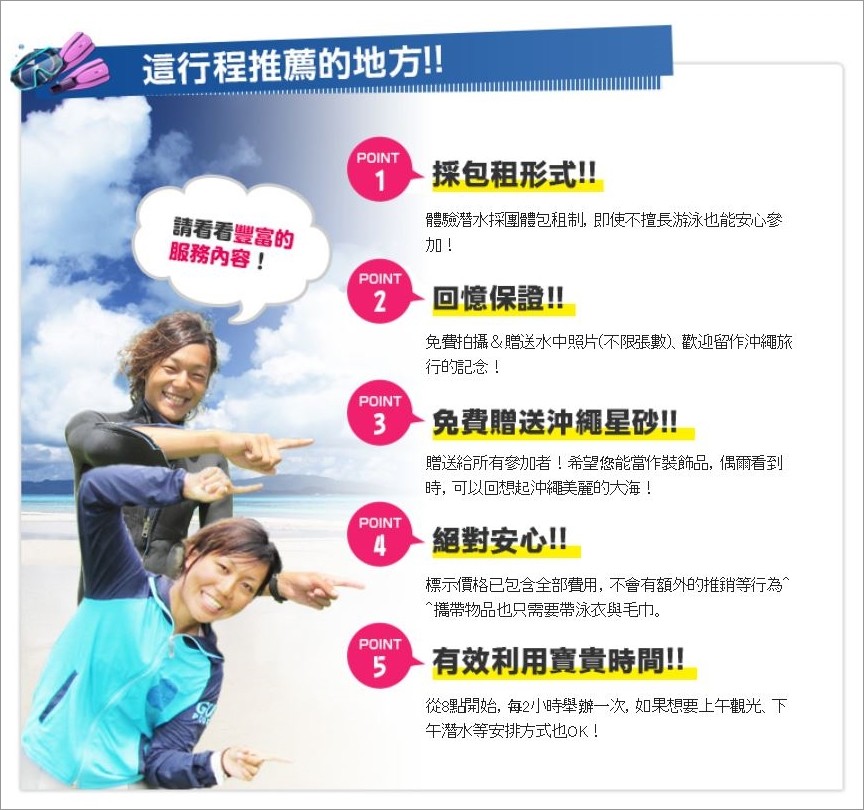 ▼MyDiving的潛水服務在官網上寫得相當清楚,連不會游泳的朋友都可以安心參加,而且還會免費拍攝&贈送水中照片(不限張數),最後還會免費贈送沖繩星砂,讓大家有個美好的回憶與紀念!另外只要攜帶泳衣、毛巾即可,也不用擔心會被額外推銷,玩起來也會更開心!另外潛水的時間有8:00、10:30、13:00、15:30等時段,大家都可以視個人行程來安排,只要安排2小時頂多一個半天即可,完全不會浪費旅行的時間唷!