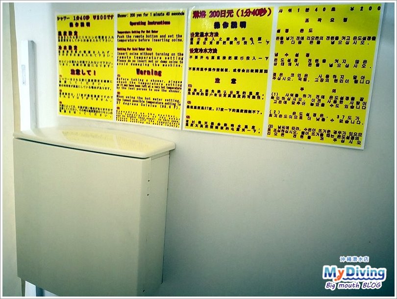 ▼淋浴是200日圓可以沖洗100秒,大口建議大家可以先脫光光再投幣使用,其實100秒也滿夠用的!想要洗冷水的朋友可以直接投幣使用,如果想洗溫水的朋友可以先打開電源、設定好溫度後再投幣,就可以洗到熱呼呼的溫水囉!這裡也有中、英、日、韓文說明,大家也可以照著說明使用就沒問題啦!