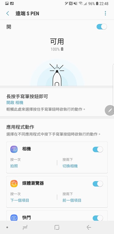 簡單示範遠端拍照功能供大家參考,在 S Pen 的設定選項裡有個「遠端 S Pen」的調整選項,其中可以設定 S Pen 上的按鈕按一下是什麼功能,按兩下是什麼功能,舉例來說原先預設按一下 S Pen 可以拍照,按兩下 S Pen 可以切換相機,但如果時常錄影的人也可以把其中一個選項調整成按 S Pen 就能錄製影片,這樣就可以更彈性的放置 Note 9,然後用 S Pen 來調整何時要開始拍照或錄影。