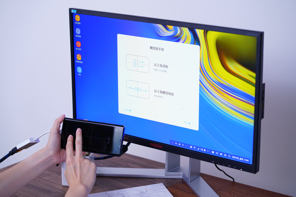 先前三星曾推出 Samsung DeX 配件,讓手機插上去一秒就能變成桌機介面,用熟悉的方式更多工的操作 APP 功能,Galaxy Note 9 則是更方便,只要有一條 Type-C 轉 HDMI 線就行,只要將 Galaxy Note 9 接上螢幕,這時畫面就會自動切換為 Samsung DeX 的桌機介面,Note 9 則會變成觸控板兼鍵盤,讓使用者可以透過手勢直覺的操作 Samsung DeX 畫面。