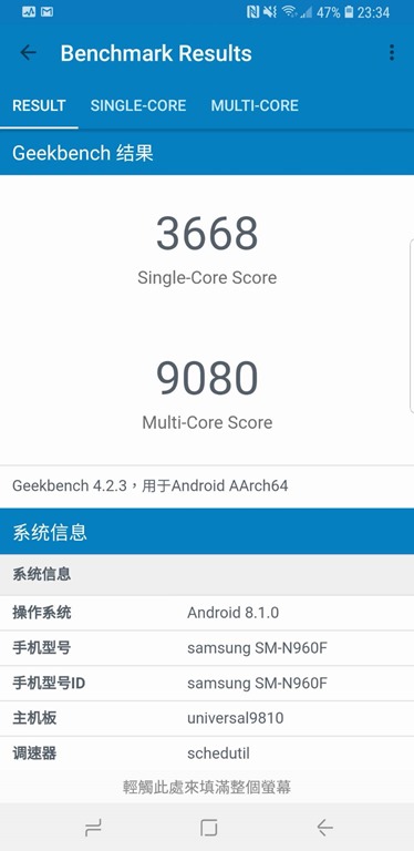 Note 9 為 Exynos 9810 處理器、6GB RAM、128GB ROM 版,附上安兔兔以及 Geekbench 4 跑分供大家參考: