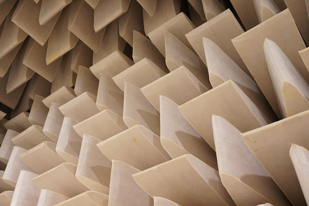 *無響實驗室中為了避免回音干擾,牆面與屋頂布滿了椎狀吸音裝置