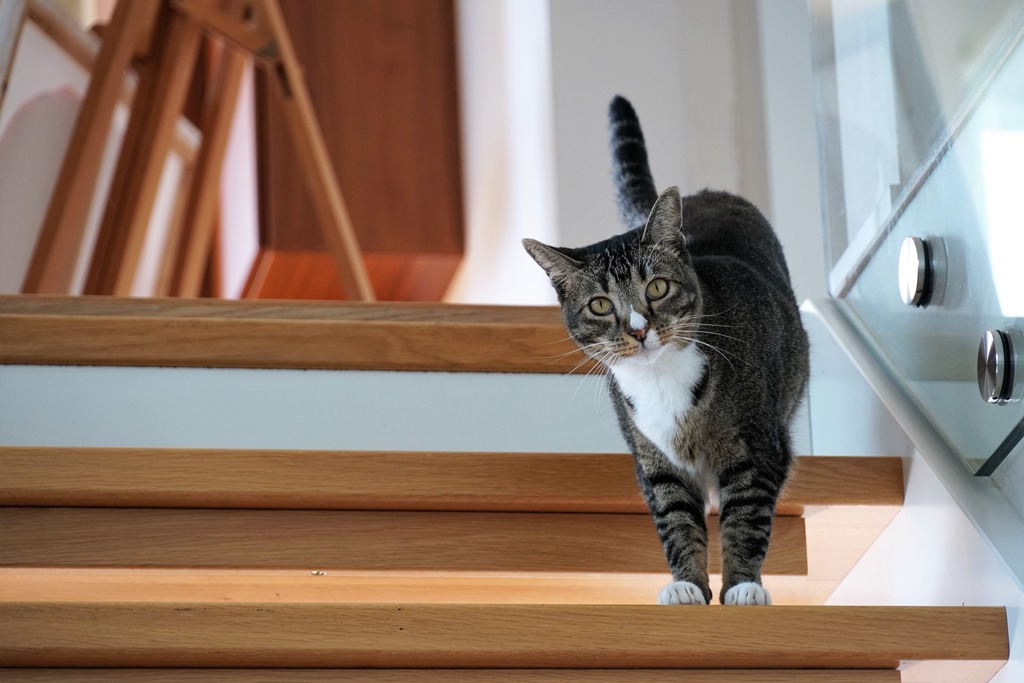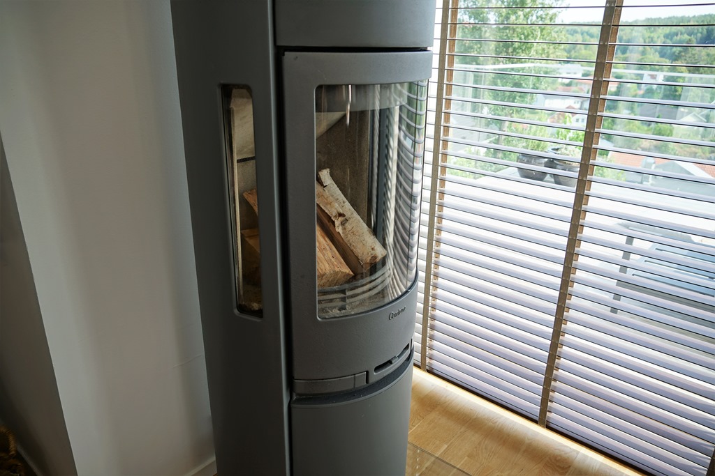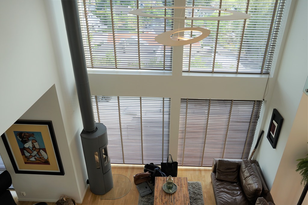 置放在家中梯下原本以為是裝置藝術的藤編筒狀裝飾,仔細一看它其實是循環扇、二樓柱子上以繩索包覆點綴的跳色包覆,原來它是貓抓板、巧妙隱身於客廳中擺放著木材的暖爐,在寒冷冬天是可以發揮作用的溫暖來源。除此之外,大面積的窗戶,帶給室內非常充足的光線,白色、灰色與黑色搭配著木製家具,更讓家中更有明亮感。