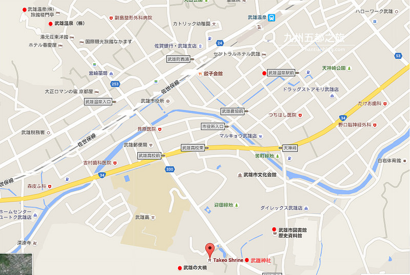 武雄神社距離武雄市圖書館 蔦屋書店步行約5分鐘的距離