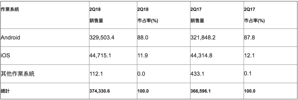 表2:2018年第二季各大作業系統的全球智慧型手機銷售量(單位:千支)