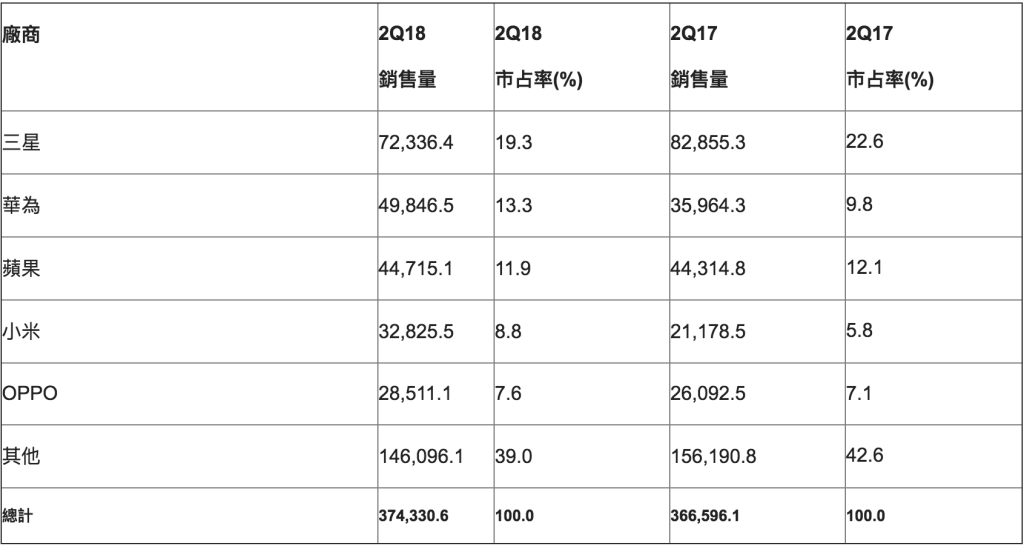 2018年第二季全球各大廠商智慧型手機銷售量(單位:千支)