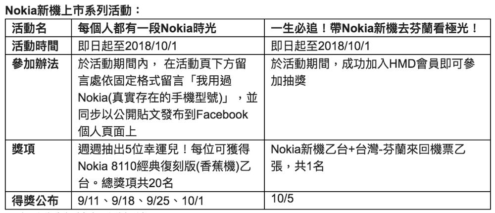 HMD Global 將於 9 月在台灣正式重磅推出新機,這次為了迎接新機的到來,特地於即日起至 2018 年 10 月 1 日止,舉辦「每個人都有一段 Nokia 時光」、「一生必追!帶 Nokia 新機去芬蘭看極光!」系列活動,祭出經典復古香蕉機大放送、粉絲獨享抽新手機、芬蘭來回機票等多重大禮,喜愛 Nokia 的粉絲絕對不能錯過!