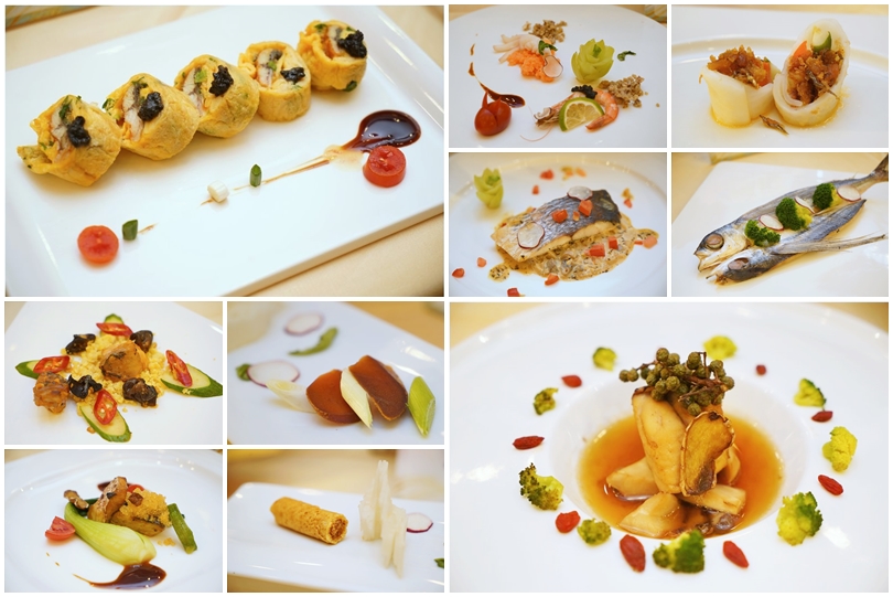 ▼除了林聰賢主委跟主廚溫國智一同料理的虱目魚拌醬金目鱸魚排之外,還有麻油薑汁龍虎石斑、秋刀魚飛魚一夜干烤、熟成龍膽石斑透抽、清斑佐鬼頭刀干貝醬、蒲燒鰻壽司蛋捲、五味軟絲蝦、蔥薑焗赤鰭笛鯛、烏魚子鰻魚蛋捲等,每一道都營養美味又好吃!