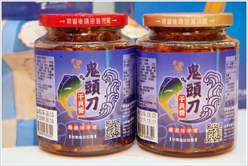 ▼鬼頭刀因為喜歡追逐飛魚為食所以又被稱為是飛鳥虎,是台灣東海岸的洄游魚類;鬼頭刀的肉質相當細緻,營養價值高,新港區漁會特別捕撈肥美的鬼頭刀來製作成干貝醬,吃起來風味獨具又鮮甜美味!
