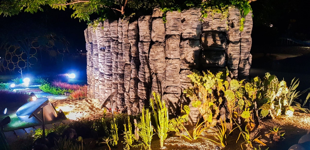 而玄武岩石柱裡設有『雨水撲滿』,頂部的水盤是植栽的水耕盤,也是雨水收集器,隱藏在鋼骨結構裡的集水桶,在乾旱缺水時,可以應急成為澆灌景觀植栽的備用水源,富有教育意義兼具環保。