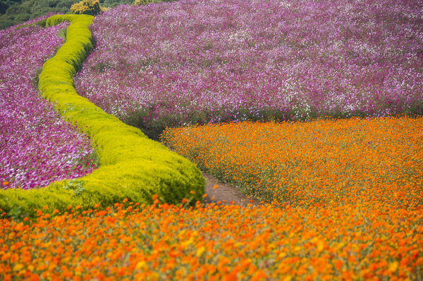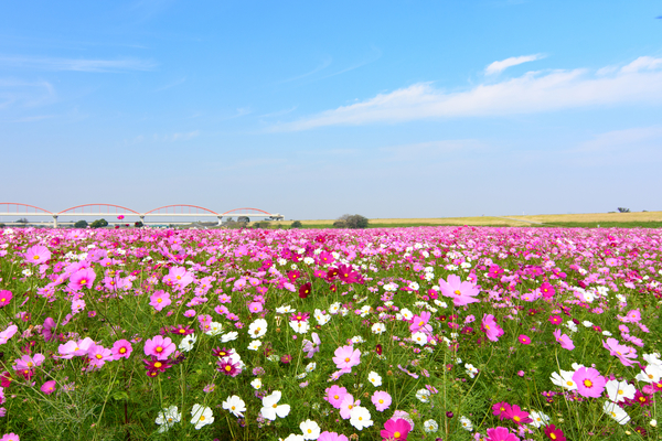 位於崎玉縣鴻巢市的「吹上波斯菊花田」,為關東地區的人氣花海景點,6.3公頃的花田,盛開著1,000萬株以粉紅色與黃色為主色調的波斯菊,晴天時還可從花田遠眺秩父群山與富士山,附近更有長度約1,100公尺、全日本最長的紅色水管橋,多樣化的拍照美景,非常受到遊客青睞。