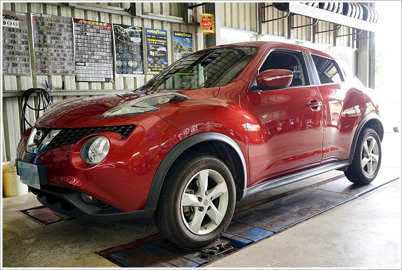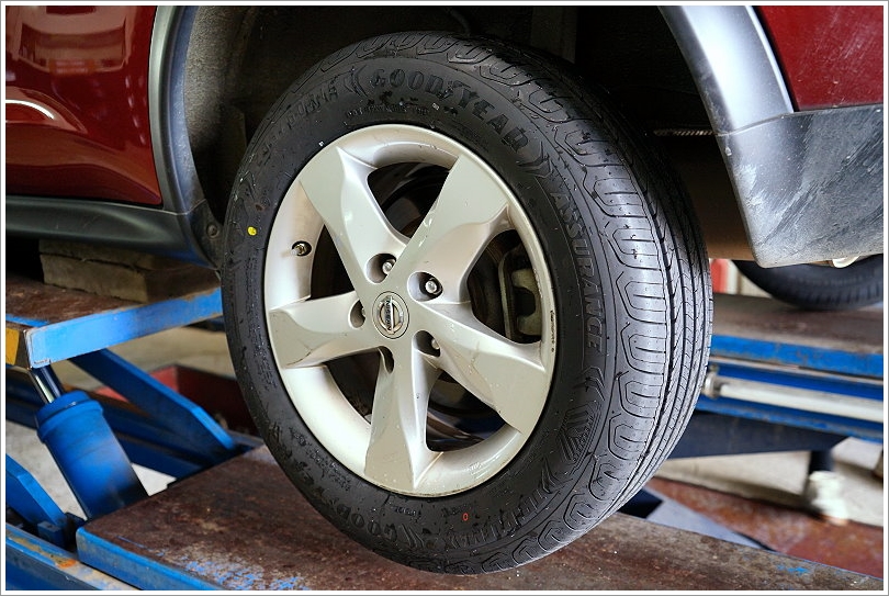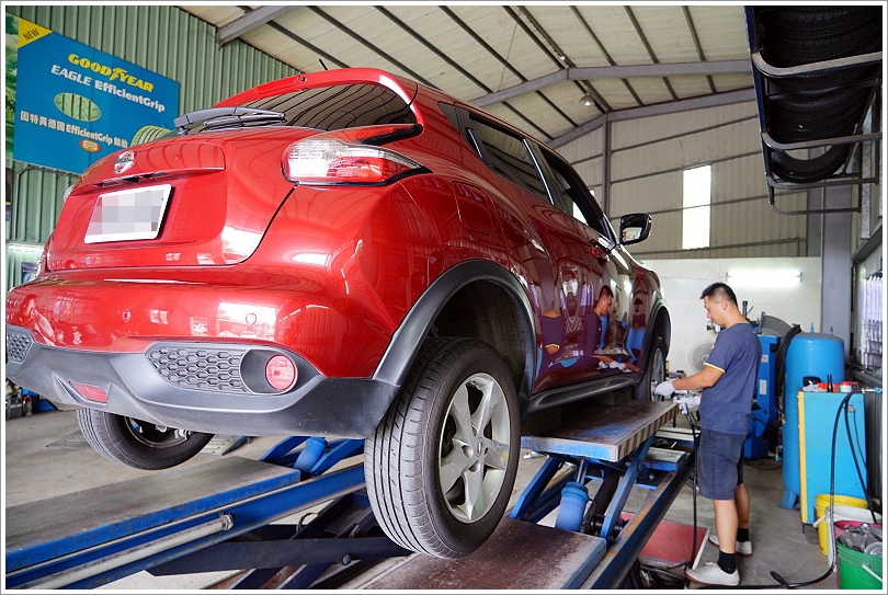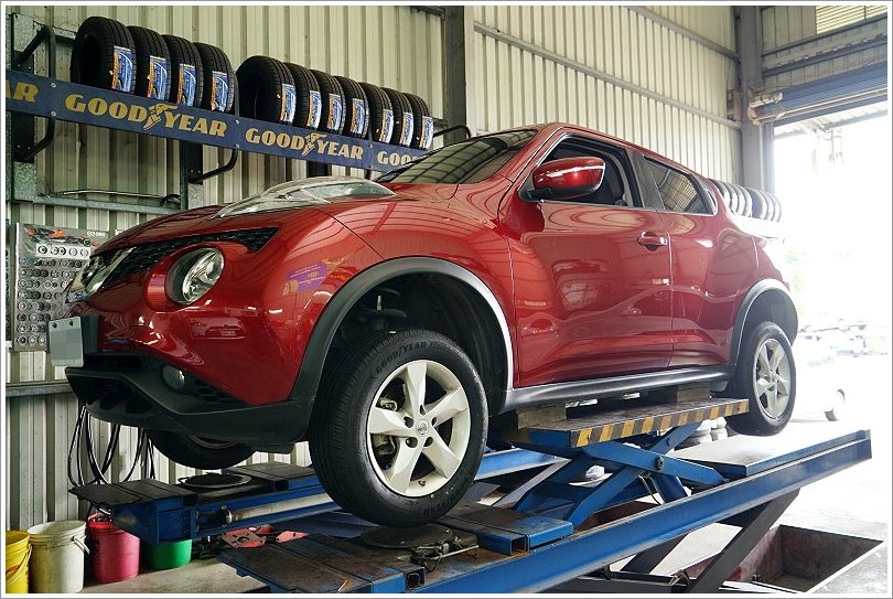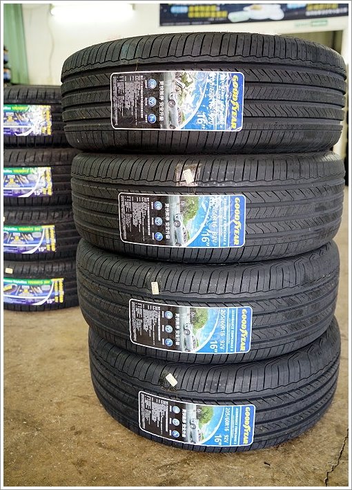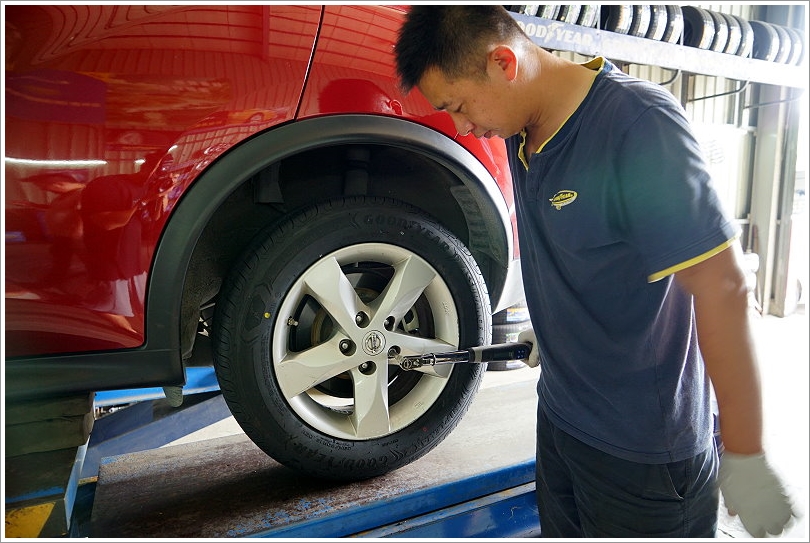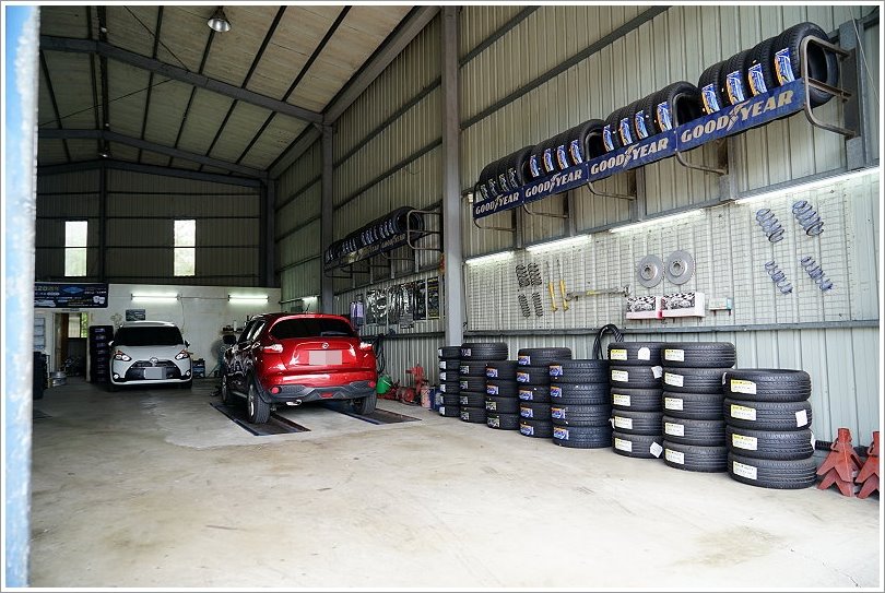 ▼老闆很親切的幫我們把車子移動到手術區(誤),這裡擺著各式各樣型號的固特異輪胎,因為幾乎一年才換一次輪胎,說不好奇才怪,每次到了換胎的地方,我總是坐不住的到處看看,幸好我預約的時段現場沒有其他客人,所以還可以跟老闆聊聊天,順道請教輪胎的問題~