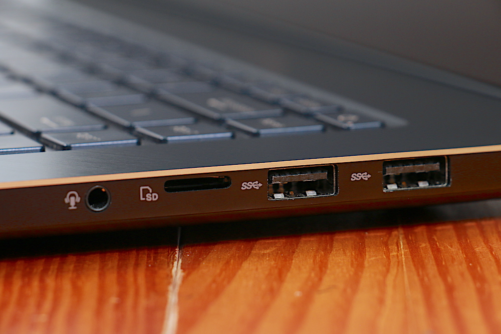 連接埠方面,ZenBook Pro 15 的機身右側配備一個 3.5mm 耳機孔、一個 microSD 讀卡機,以及兩個 USB 3.1 Gen 2 Type-A 連接埠。另外,如果需要外接 RJ45 網路線,也可以到 ASUS 商店選購 USB 轉 LAN 連接埠傳輸器使用。