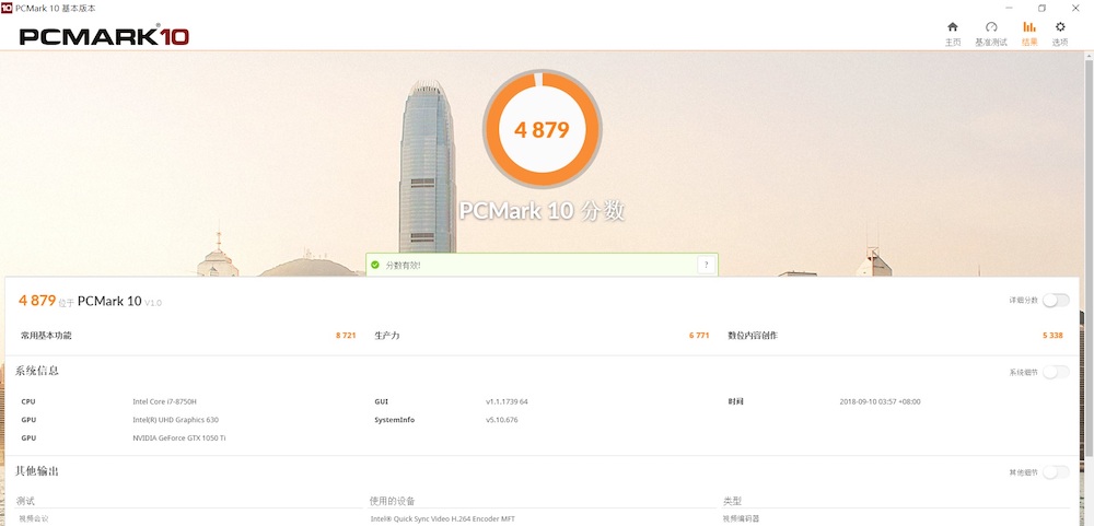 除了使用 3DMARK 11 來測試圖形運算成績之外,同時也使用最新的 PCMARK 10 來測試綜合效能表現,從實測結果可以看到,ZenBook Pro 15 在常用基本功能拿到 8721 分、生產力拿到 6771 分、數位內容創作拿到 5338 分,綜合效能成績方面則是拿到 4879 分,單項與綜合效能都有非常優異的表現,無論是專業或是一般使用者,ZenBook Pro 15 絕對能勝任每一項工作。