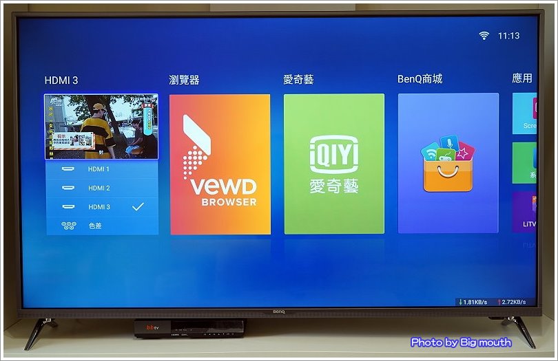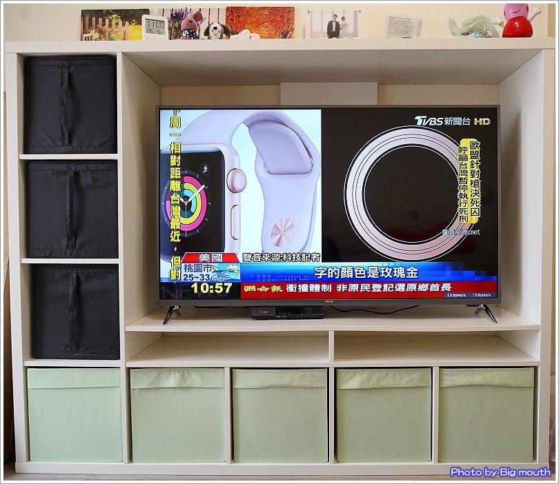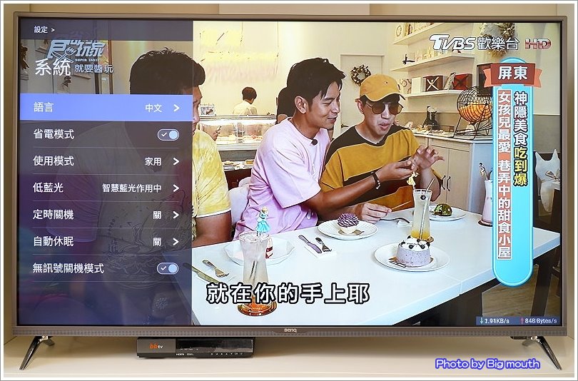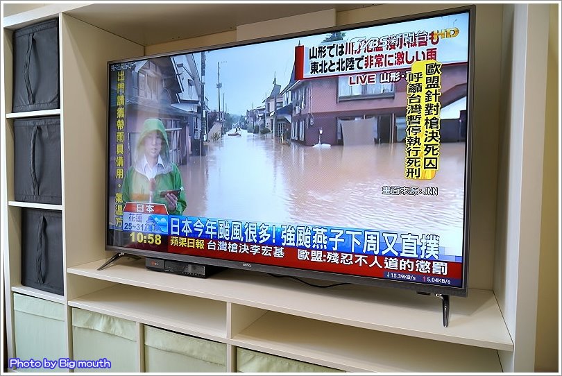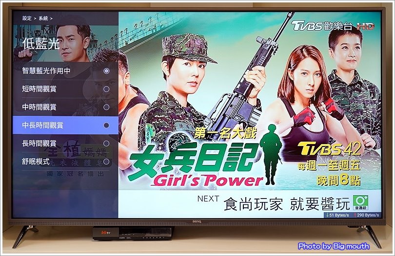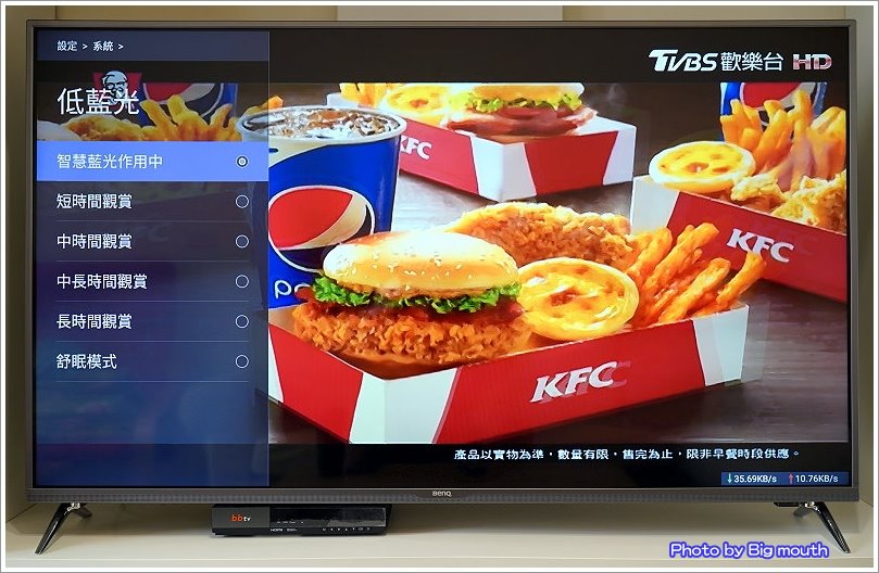 ▼另外這台BenQ電視不僅擁有獨特的智慧藍光2.0功能,最厲害的是可以自動調整觀賞亮度,如果在較暗環境的話,就會讓畫面變得柔和呈現,降低用眼負擔;像大口家客廳的採光非常好,天氣好的話都是直接拉開窗簾讓光線透進來,如果在明亮的環境,智慧藍光2.0就會自動調整到最佳亮度,連細節表現也很清楚不失真,這時候欣賞電視雙眼也不會覺得刺眼,反而可以很舒服的收看電視!