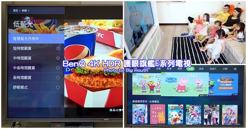 大口夢想有一台超大電視已經很久了!總覺得大電視可以全家一起開心收看節目,有時候大口跟口咩就算想在家看個電影也覺得非常過癮!但液晶電視不只是螢幕大、看得清楚就好,還要有護眼功能,對於家有三寶的我們來說更是非常注重的一點,這台55吋的BenQ 4K HDR電視E55-700就是一個不錯的選擇!BenQ一直致力於護眼功能的持續進化,還加入了更強大的「智慧藍光2.0」及最近開發的「舒眠模式」,畫質方面也導入了最熱門的4K HDR技術,不管是顏色、對比度、清晰度與流暢度都大為提升,且連細部的明暗、色彩都呈現的很清楚,同時也不會讓你睡不著覺,強大的護眼模式也可以安心讓小朋友一同欣賞!此外也導入了愛奇藝、LiTV等追劇神器,讓你不用侷限在小小的手機螢幕上也能跟上最流行的影片、資訊,真是方便又實用!