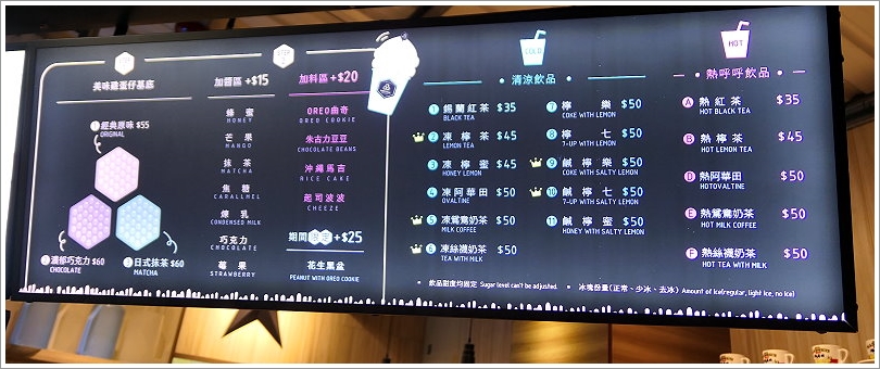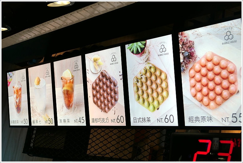 ▼上頭燈箱出現的是雞蛋仔的基底,另外也有冷熱飲可供選擇搭配!