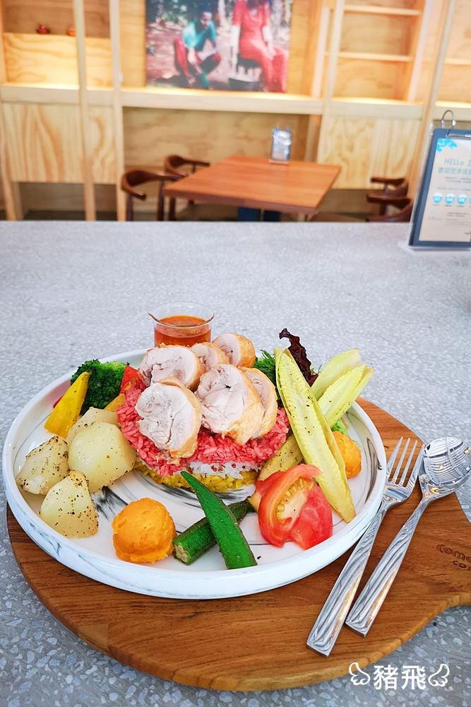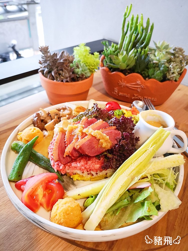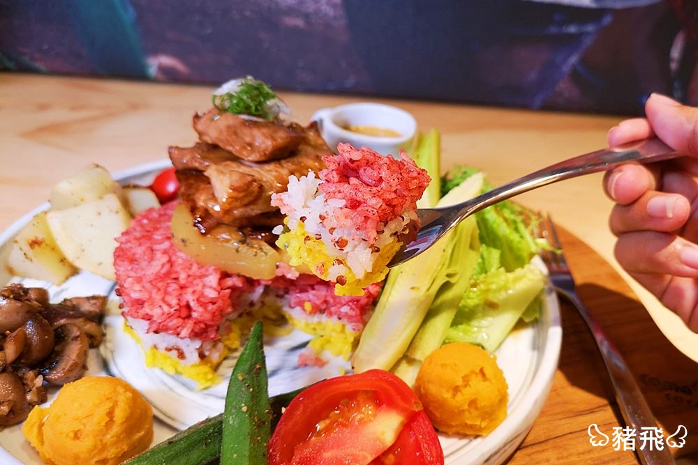 配色如彩虹般繽紛多彩的彩虹飯是最近幾乎每桌必點的商品,我每次來幾乎都會點一份跟朋友分享,選用數十種新鮮蔬果、和有世界夢幻米之稱的馥米,搭配特製醬汁,組合成紅白黃三種彩色米飯,少油少鹽特色成為現代人喜愛的餐點首選,不僅飽足度很足夠(男生吃也會很飽喔),連外在都成為網路話題,馥米外型比一般米小,口感獨特,有類似糯米的Q彈又有一般米的香氣,色香味都超越日本米,吃了讓人難忘。