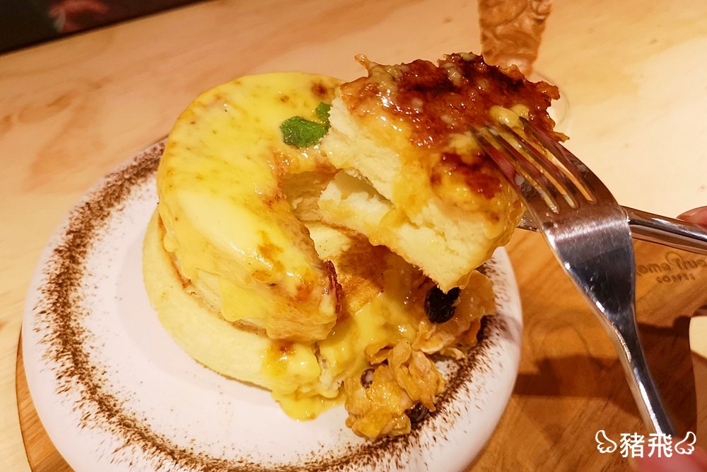 近幾年台中掀起一股厚鬆餅熱潮,成真咖啡的舒芙蕾也成為網路推薦名店的前三名,使用日本紫羅蘭特級日本麵粉加入貴鬆鬆的義大利 RicottaCheese 製作的厚鬆餅,把兩面煎烤至金黃澎鬆,呈現出ㄉㄨㄞ么么姿態,足足3 公分厚度帶出獨特綿軟口感,起司香、雞蛋香完美搭配,可以先單獨品嘗原味舒芙蕾,再搭配甘苦巧克力醬,新鮮香蕉與香脆堅果更添加口感,多種吃法。