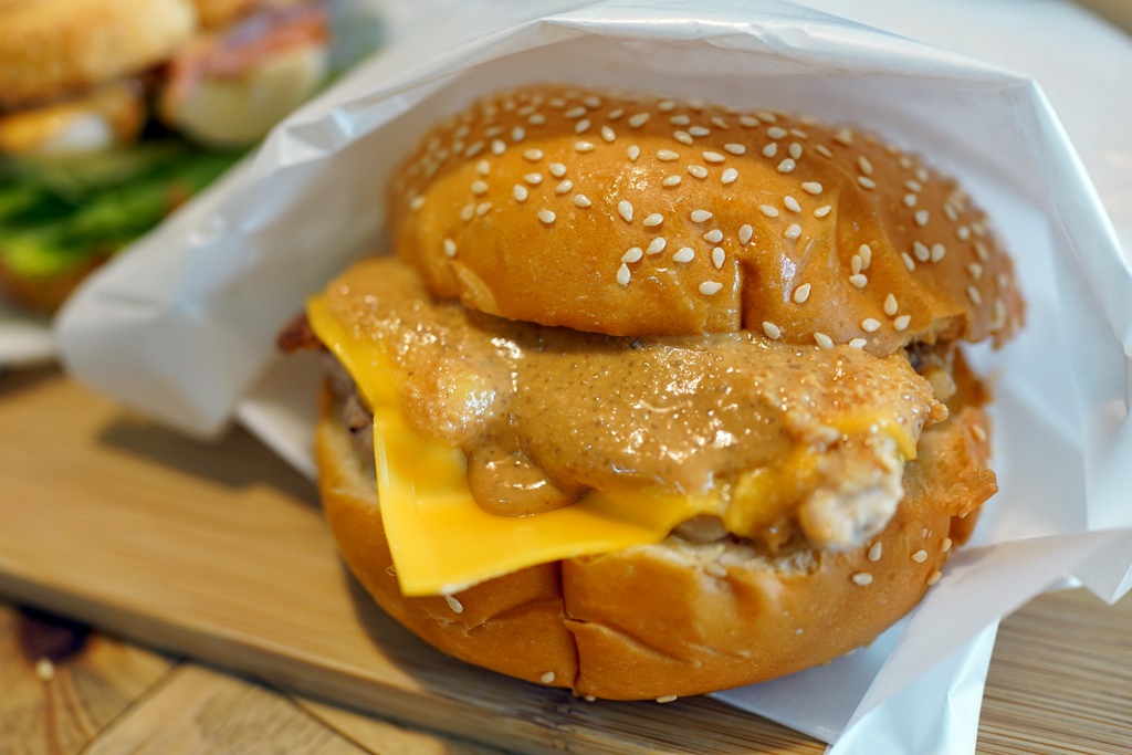 因為NN對生菜過敏,才請店家不要加生菜,不然原本應該很豐盛,鬆軟的漢堡麵包,搭配香嫩的雞腿肉、起司與花生醬,口味相當不錯,花生醬是店家自製的,吃起來味道很香濃,但不會很膩口。