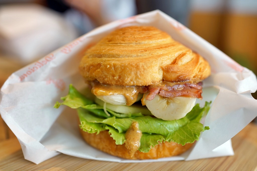 看過我不少早餐文的朋友應該知道我很喜歡吃丹麥麵包,丹麥漢堡的口感很豐富,吃起來很有層次感,搭配生菜、蘋果片、香蕉、培根與自製花生,香酥爽脆又綿滑的口感讓人驚艷,我自己覺得吃完還蠻飽的!